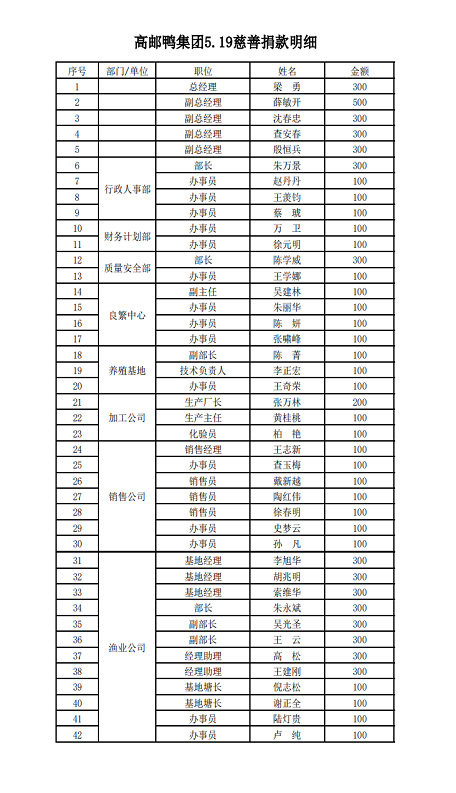 為大力弘揚慈善精神,營造救危濟困、樂善好施、團結互助的良好風尚,高郵鴨集團積極響應號召,開展“5·19慈善一日捐”活動。