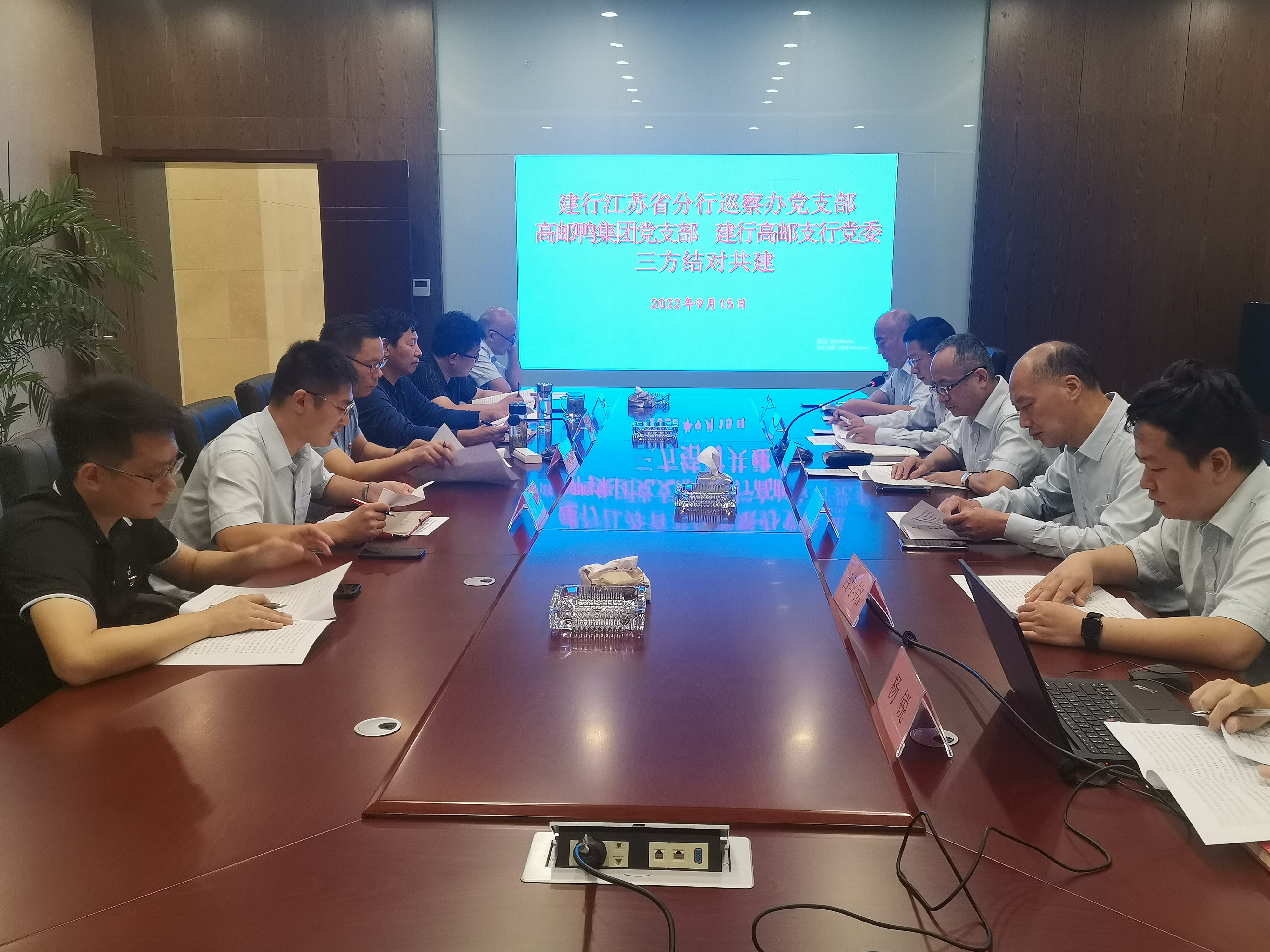 9月15日上午,中國建行江蘇分行巡察辦黨支部、高郵鴨集團黨支部、建行高郵支行黨委開展三方結對共建活動。建行江蘇分行巡察辦黨支部委員、巡察組組長沈陽,建行高郵支行行長倪春陽,高郵鴨集團黨支部書記、總經理梁勇分別帶隊參加結對共建活動。