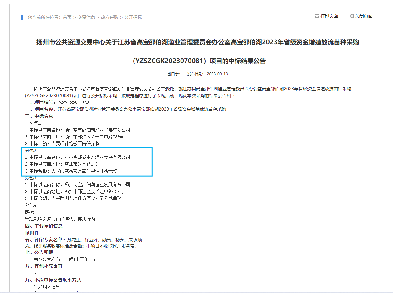根據揚州市公共資源交易中心的中標公告,高郵湖漁業公司中標江蘇省高寶邵伯湖漁業管理委員會辦公室高寶邵伯湖2023年省級資金增殖放流苗種采購項目,中標金額為22.5萬元。