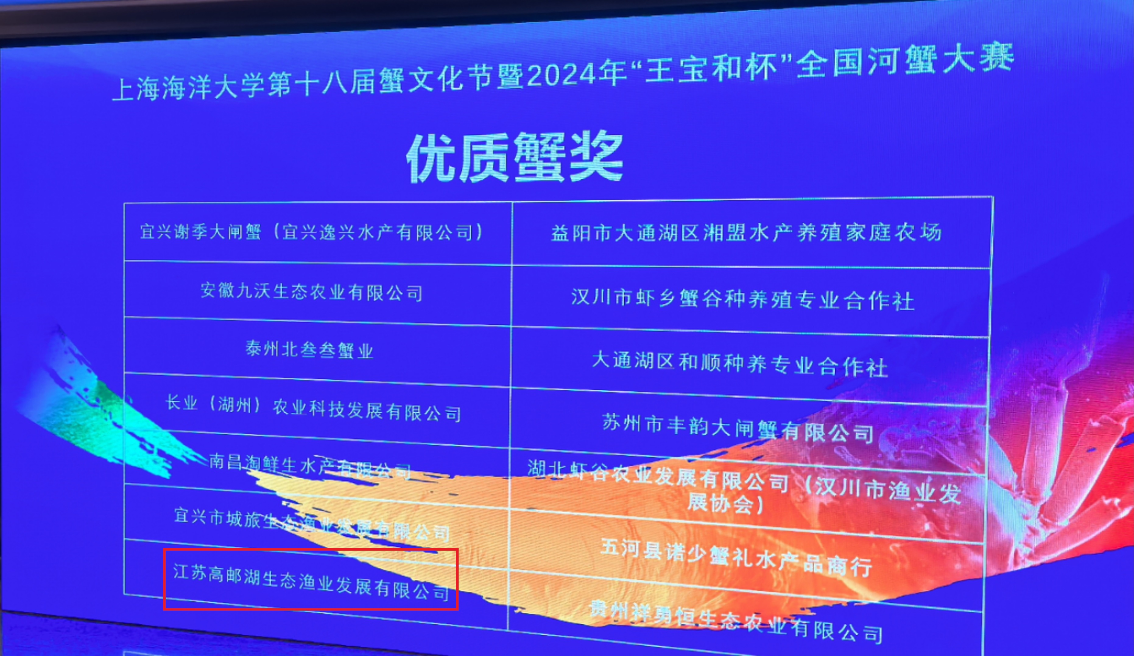 在此次大賽中,各位專家評委始終堅守公平、公開、公正的原則,以專業的眼光和嚴謹的態度對每一只參賽河蟹進行評判。比賽現場氣氛熱烈,競爭格外激烈,各個參賽單位都拿出了自己的精品。最終經過激烈角逐,14家獲得優質蟹獎、15家獲得最佳種子獎、15家獲得最佳口感獎、110家獲得金蟹獎。漁業公司選送的河蟹脫穎而出,榮獲王寶和杯全國河蟹大賽“優質蟹獎”榮譽稱號。
