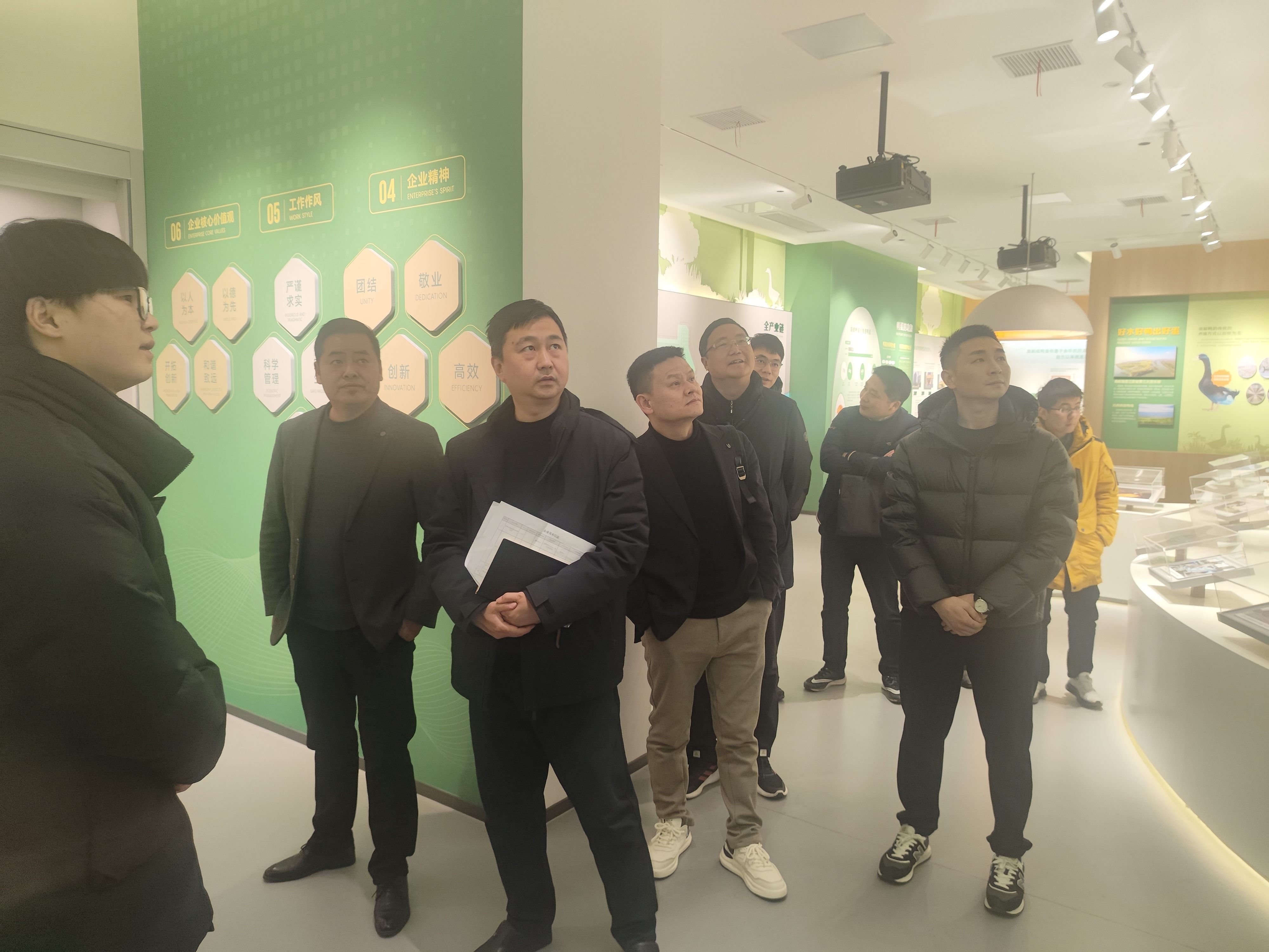 考察團隊一行走進高郵鴨集團企業文化展廳,詳細了解了高郵鴨集團大事記、高郵鴨的品種優勢、蛋品的加工及銷售、全產業鏈打造情況。