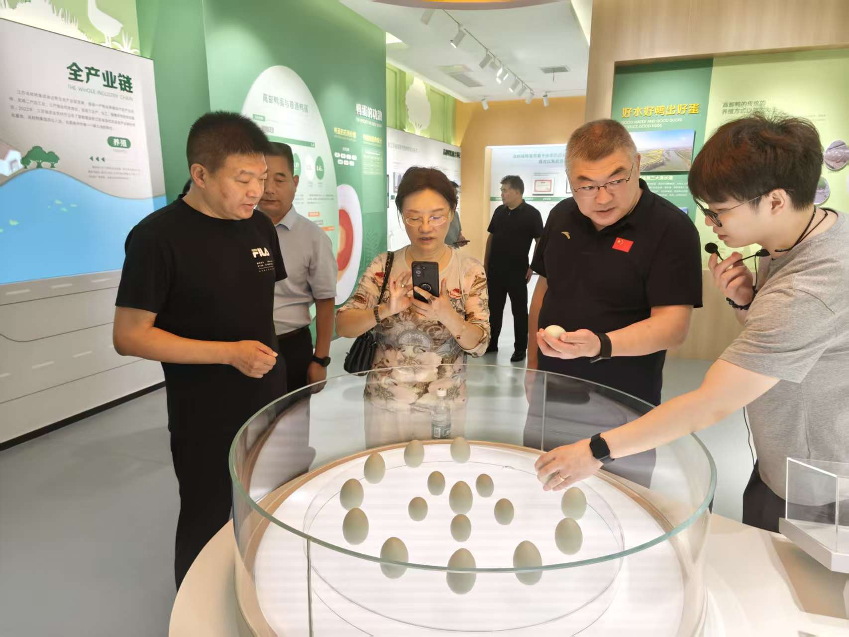 調研走訪過程中,考察團在高郵鴨集圖企業文化展廳詳細了解了高郵鴨蛋的前世今生、高郵麻鴨的保種養殖、高郵鴨集團的發展歷史及新產品研發等情況。